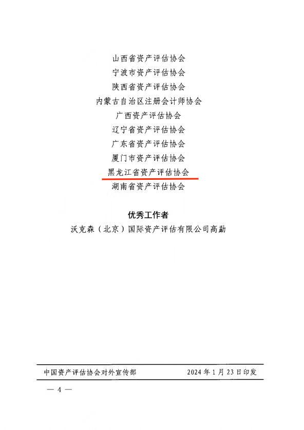 近日,中国资产评估协会对2023年度资产评估行业宣传工作进行表彰。黑龙江省资产评估协会被授予2023年度全国资产评估行业宣传工作“先进单位”称号。